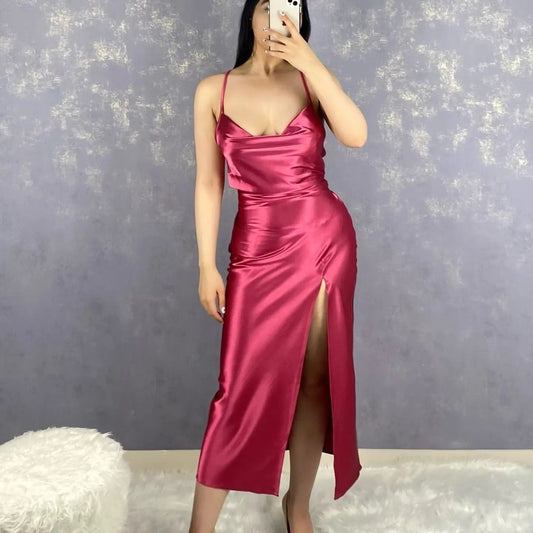 (30%) OFF - Silk Halter Cut-Out Bodycon Midi Dress with Side Slit