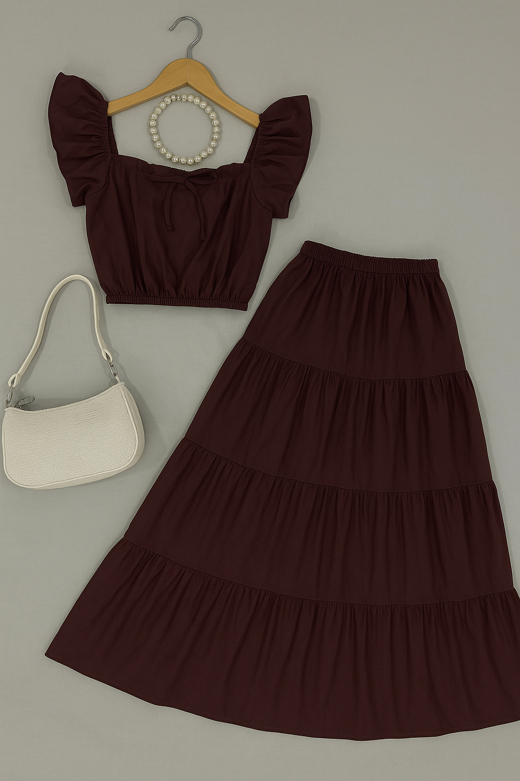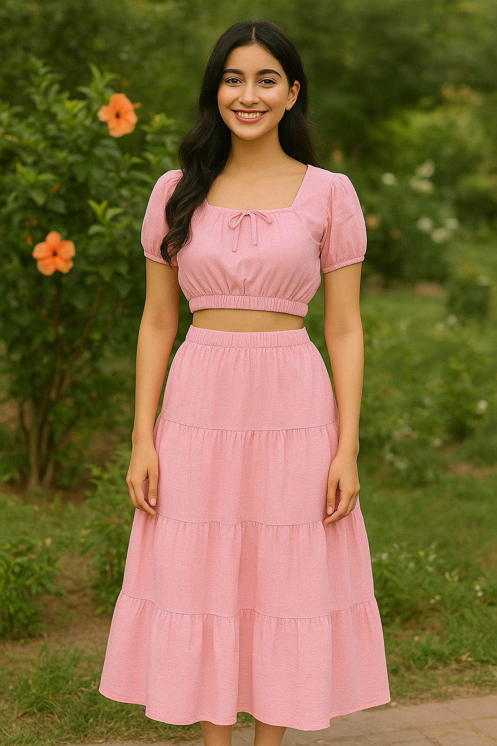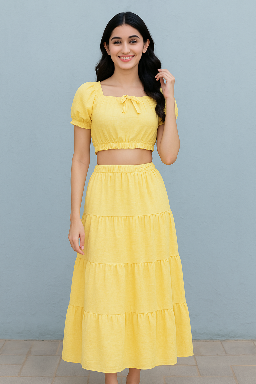 (30%) OFF - Cotton Lawn Co ord Set with Puff Sleeve Top & Tiered Maxi Skirt
