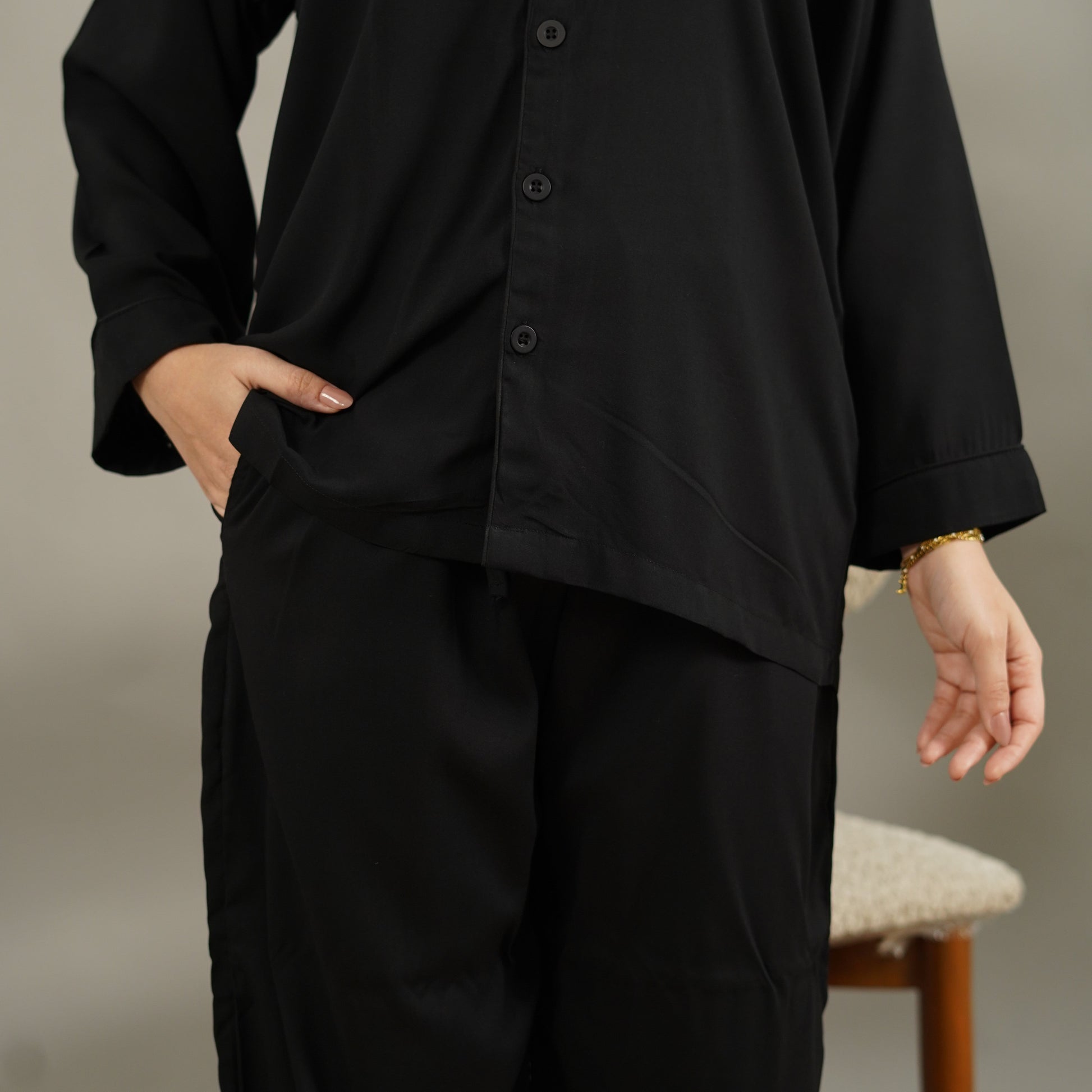 Loose-fit button-down shirt with smart collar aur relaxed sleeves isay classy yet minimal look deti hain. Straight cut trousers clean finish ke sath design kiye gaye hain jo flattering fall aur graceful silhouette create karte hain.